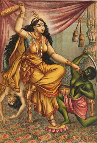 The Depiction Of Mata BagalaMukhi Silencing the demon, Guides And Enables sincere devotees to stop both the creative and the destructive powers of thoughts, intentions, and all forms of speech, and make the mind silent and still to find peace and focus.